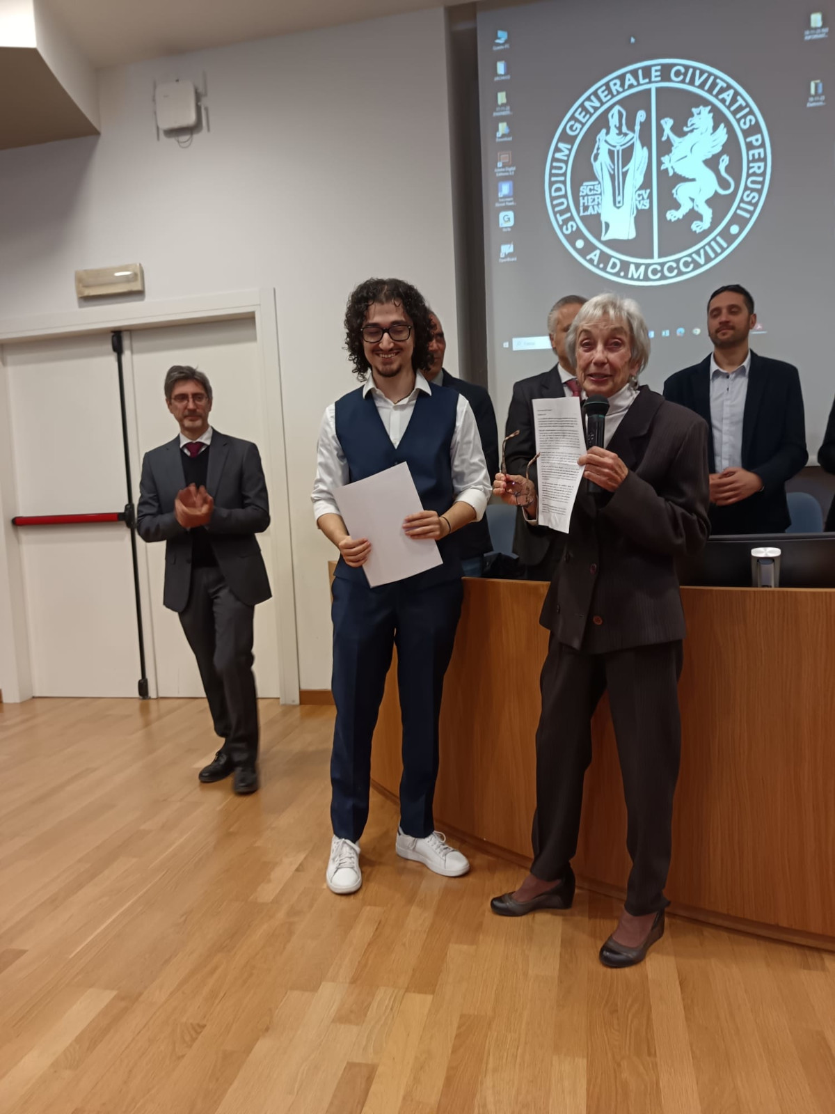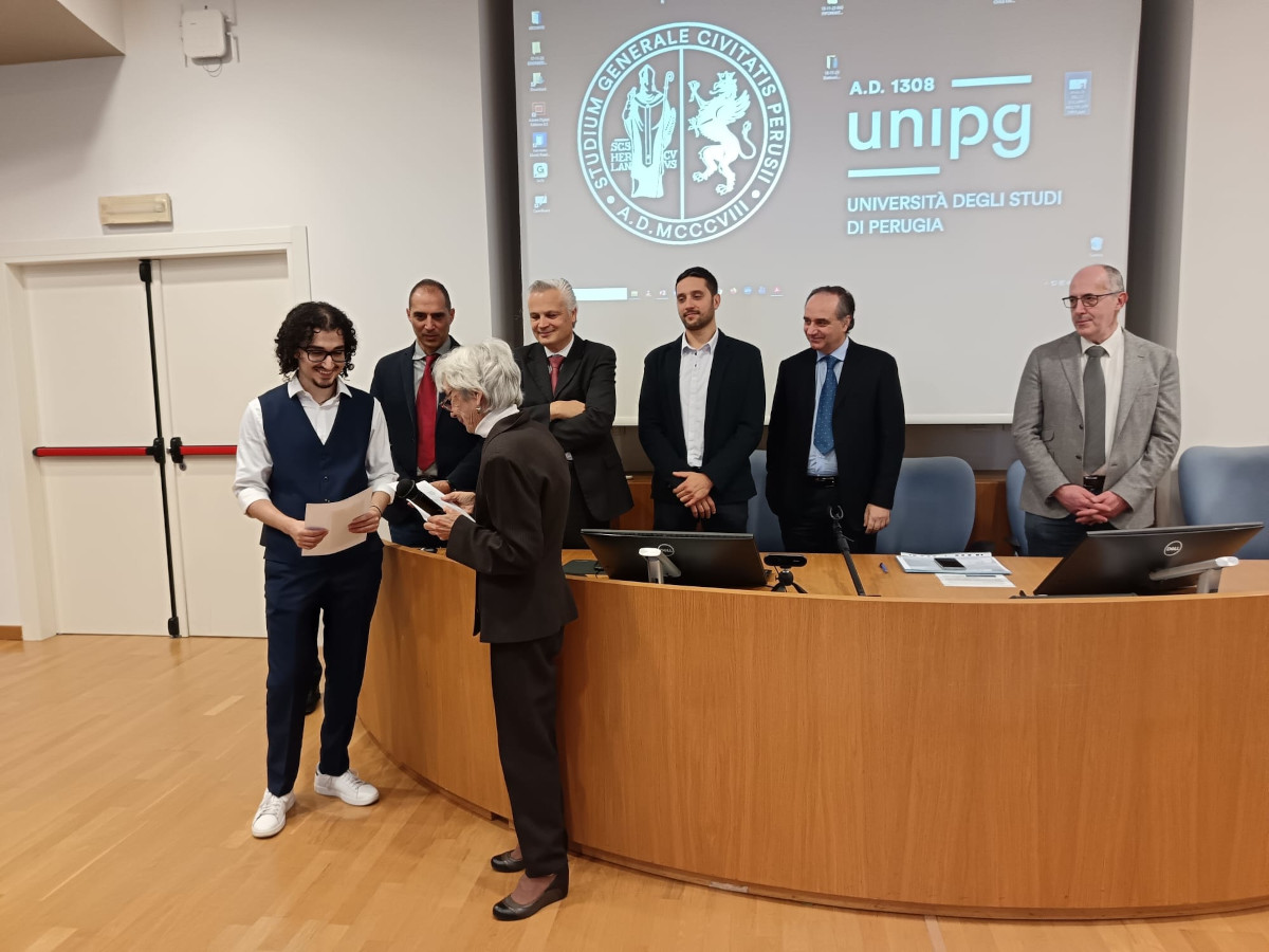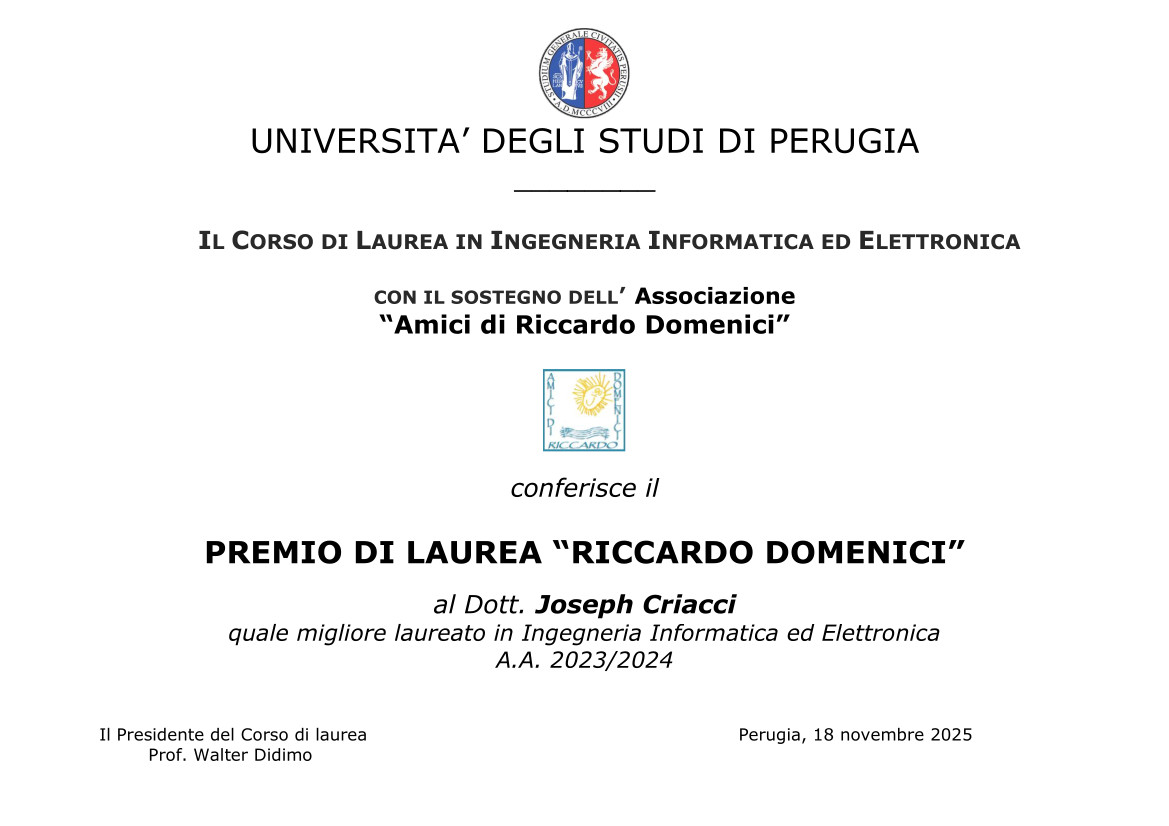 Si è tenuta martedì 18 novembre, nell'Aula Magna del Dipartimento di Ingegneria dell’Università degli Studi di Perugia, alla presenza della Sig.ra Orietta Dolcetti Domenici, del Presidente del Consiglio Intercorso in Ingegneria dell'Informazione prof. Walter Didimo, la cerimonia per il conferimento del premio di laurea in memoria di RICCARDO DOMENICI, destinato al migliore laureato in Ingegneria Informatica ed Elettronica nell'A.A. 2023/2024.